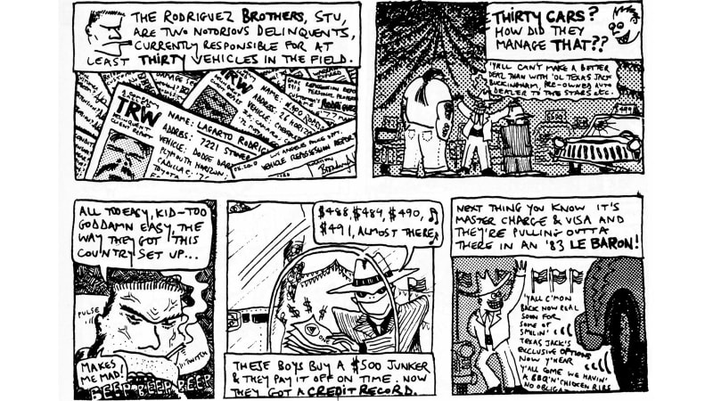 The 1983 LeBaron was considered so upscale in its day that one features in the comic strip that Alex Cox created to pitch the movie project that became “Repo Man.” Note that Otto was called Stu in the beginning.