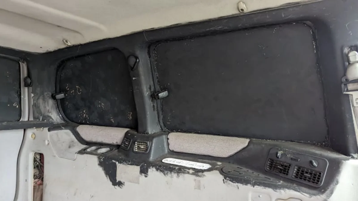 There’s body damage on the left rear and right front, suggesting a crash that may have bent the suspension past the worth-fixing threshold. Perhaps the crinkled metal just made this van too unsightly, or maybe some powertrain problem was the culprit.