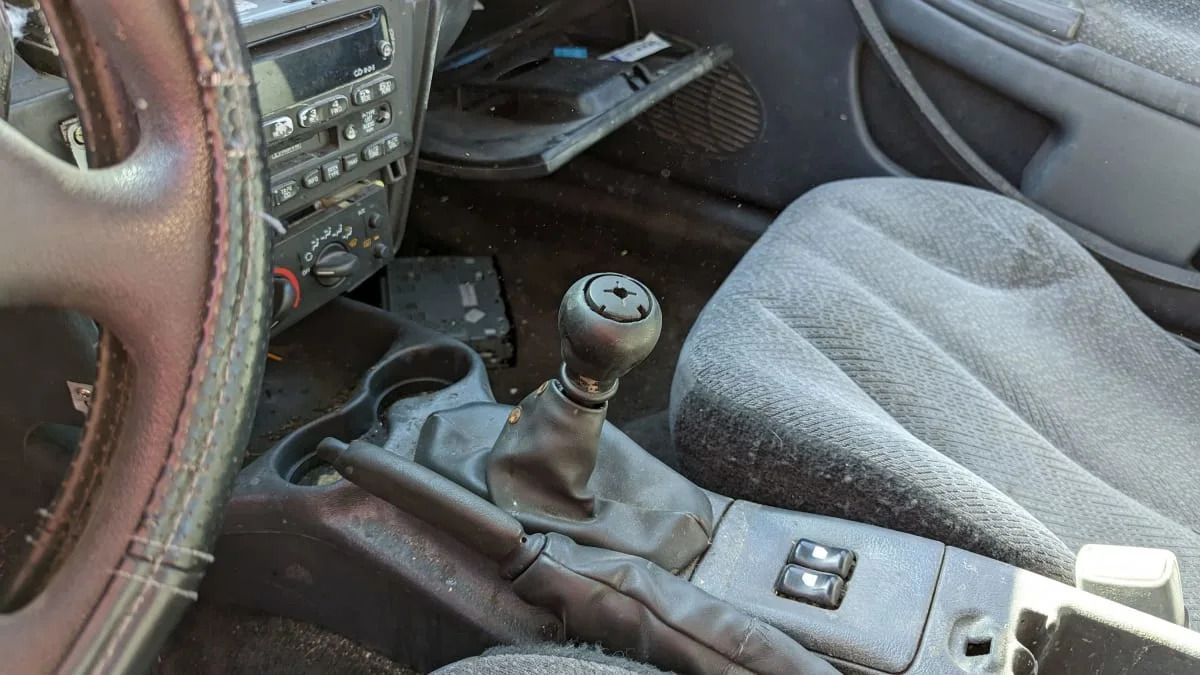 This car is used up now, with battered sheetmetal, a driver’s door from a gray 2005 Cavalier swapped in, and a faded interior.