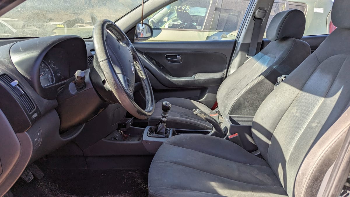 As recently as the early 1990s, a good-sized percentage of bread-and-butter commutemobiles were still sold in the United States with manual transmissions. In those days, skipping the automatic transmission made a car much cheaper, sometimes as much as 10% cheaper, and three-pedal cars tended to get significantly better fuel economy. Then automatics got cheaper and better; manuals were more often chosen by the small minority of drivers who preferred them. The U.S.-market Hyundai Elantra has had a manual transmission available since the first 1992 models showed up here (you can buy a ’23 Elantra N with a six-speed manual right now), but few 21st-century Elantra shoppers have proven willing to choose their own gears. After quite a lot of searching the car graveyards, I finally managed to find an ordinary 21st-century Elantra with a five-on-the-floor.