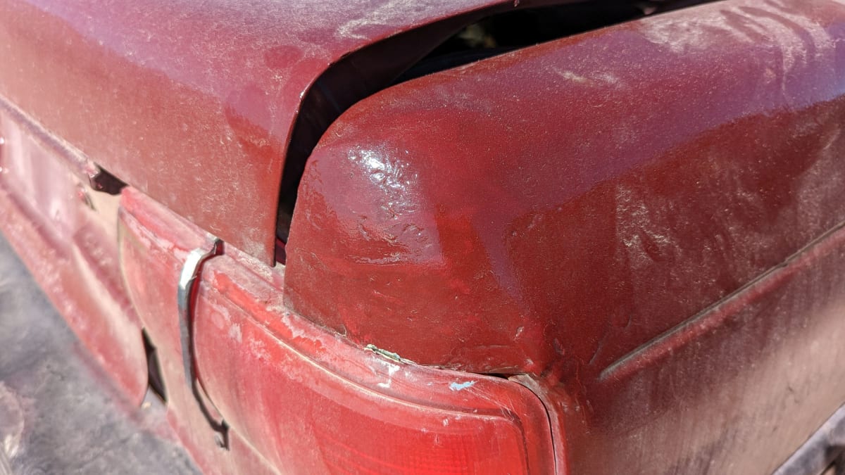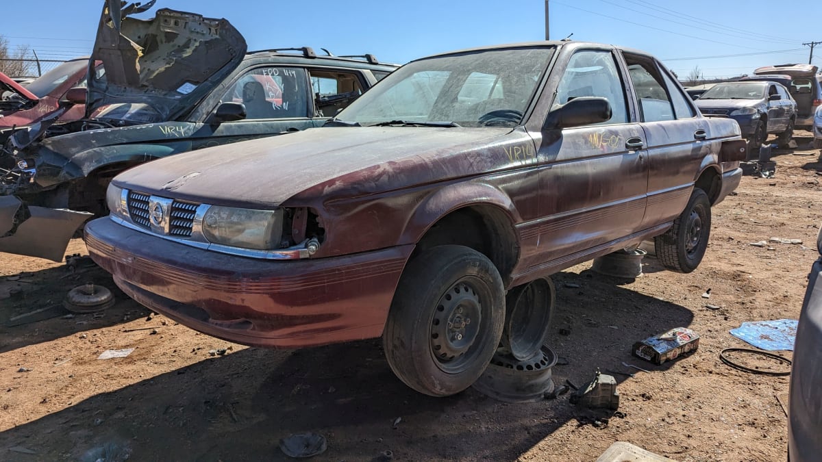 All identifying badges and build tags were scraped off this car long before it got here, and it’s apparent that it was assembled using components from many different cars. The self-service wrecking yard where it now resides has it listed as a 1998 Nissan Sentra, which is close enough.