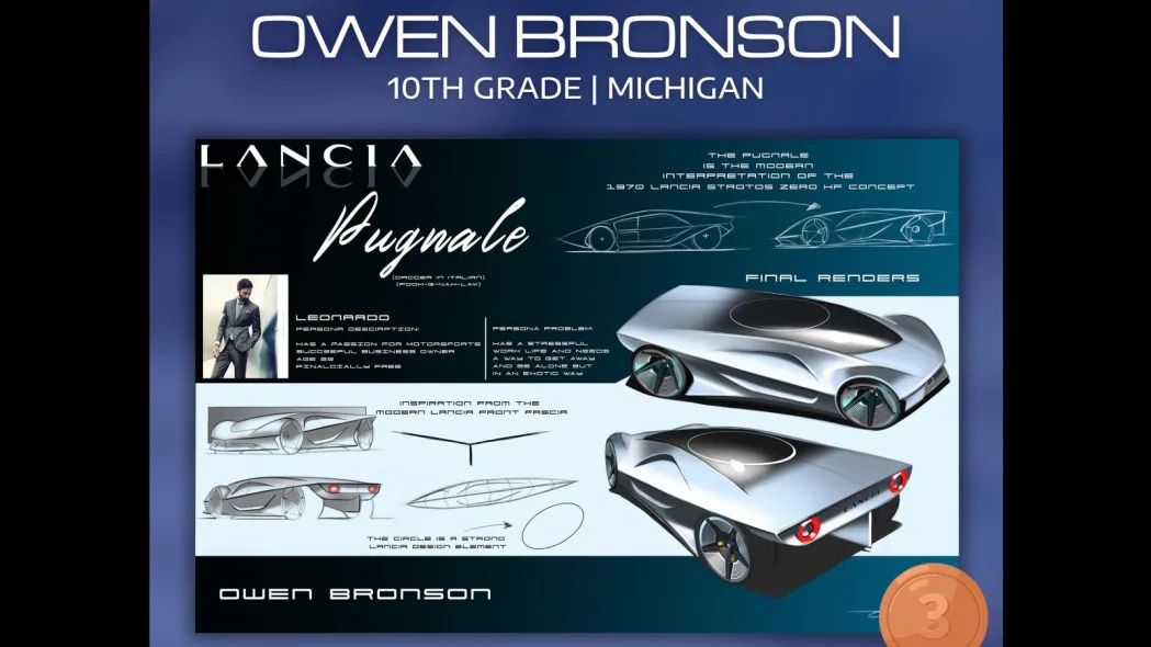 Owen Bronson of Canton, Michigan claimed third place with this Lancia Pugnale concept, explicitly called a “modern interpretation of the 1970 Lancia Stratos Zero HF Concept.” Bronson kept more of the original than Sieber, and included the same kinds of cues that the actual Lancia brand applied to its Pu+Ra Zero and Pu+Ra HPE concepts that previewed future styling for the reborn automaker, like the Ypsilon lighting signature in front, the circular aperture on the roof, and the twin taillights.