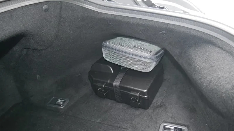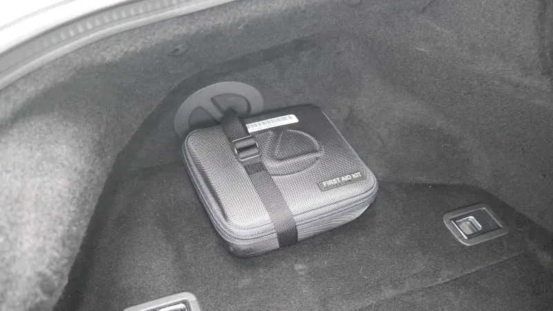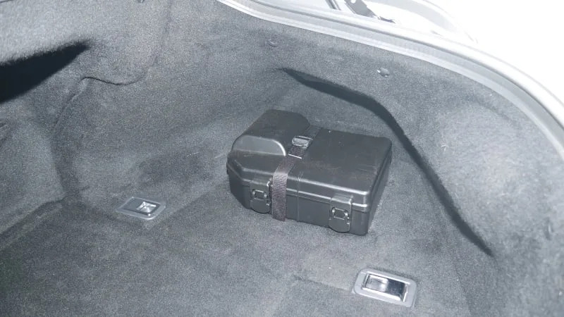 This is a first aid kit, which doesn’t seem like the best use of trunk space, but hey, people get ouchies. I decided to stuff it on top of the tire inflator box for this test.