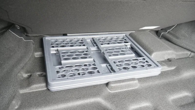 It folds up and lives in the little recess carved out for it under the floor. You can then deploy it to keep things in place inside the trunk. I’d say it would be nice if there was some Velcro or something on the bottom to prevent it from sliding around, but that’s an extra-mile thing. What a great little feature!