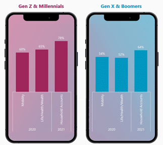A recent Carrier Management article noted how even people who were previously averse to using technology for everyday tasks have embraced it, citing an AARP study that found the percentage of U.S. adults over 50 years old (Gen X & Boomer segment) using a smartphone to make financial transactions rose to 53% in 2020, up from 37% from 2019.[iv]