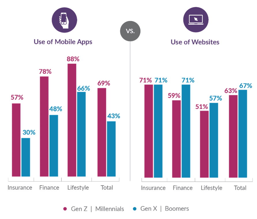 There is also considerable insurer-customer misalignment in the customer experience. Both generation segments use websites at similar levels for managing insurance, finance, and lifestyle products and services. However, insurance falls woefully behind in giving customers the ability to manage their products and services with mobile apps. This is especially concerning with Gen Z & Millennials, whose use of apps is 21 and 31 percentage points higher for finance and lifestyle products and services, respectively. These are gaps that must be closed by insurers.