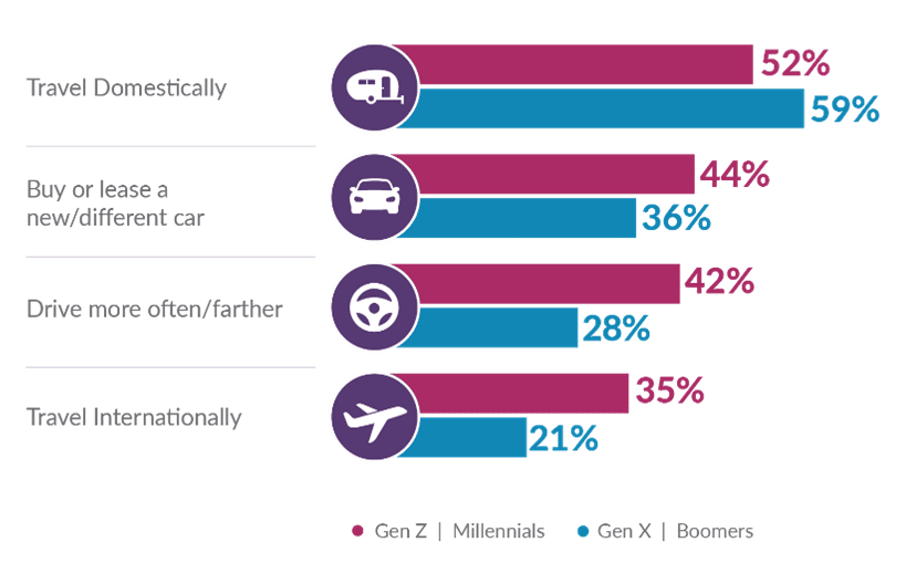 However, the automobile is still important to Gen Z & Millennials. They bought and/or sold a vehicle at over twice the rate of Gen X & Boomers, with 42% indicating they bought or leased a car, 21% sold a car, and 28% either added a car or bought their first car.