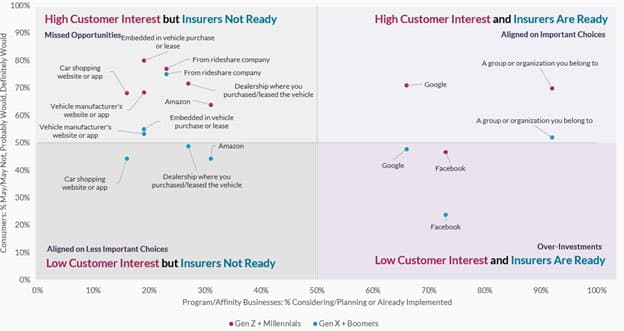 Majesco analyzed consumer data against insurer data from a joint research project with PIMA in 2020 for program business and affinity plans for three insurance segments (Life/Heath/Accident, Auto, and Home/Renter). You can see more on Life/Health/Accident and Home/Renter by downloading the Consumer Research report. Our analysis was aimed at figuring out if insurers are aligned to customer sentiment regarding how they would like to buy auto/mobility insurance.