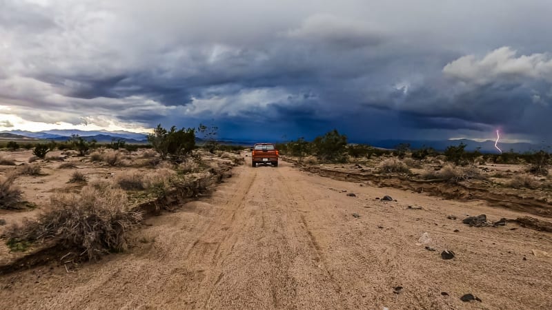 As we thundered toward the river crossing and our final campsite of the trip at Afton Canyon, the sky thundered back, bolts of lightning streaking across the sky miles ahead. The rain wasn’t far behind, the downpour already having closed the Mojave Road through the Soda Lake dry lakebed. For the first time that day, we flipped the knob to two-wheel-drive, hopped on dry pavement and headed toward Baker.