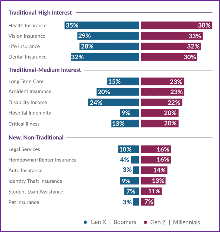 Both Gen Z/Millennial and Gen X/ Boomer SMB segments consistently align in interest for traditional benefits, having a higher interest in some than others, as reflected in Figure 2. Those in the high-interest category are what many consider the baseline benefits needed to attract and retain employees – health, vision, dental, and life insurance. Surprisingly, disability insurance was not in the high-interest group, particularly given the regulatory and legislative push and the two years of the pandemic.