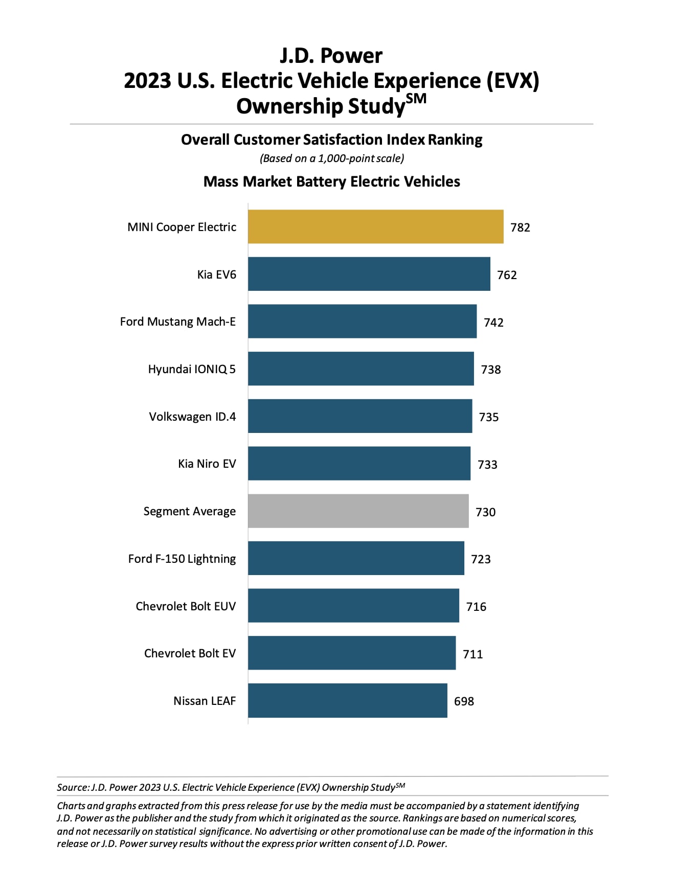 Among the ten eligible mass-market vehicles, the Mini Cooper Electric nabbed the overall win by scoring 782. The Kia EV6 came second with 762 points, keeping Kia in the top two; the Kia Niro EV won the mass-market segment the previous two years. The Ford Mustang Mach-E (742), Hyundai Ioniq 5 (738), and Volkswagen ID.4 (735) completed the top five, the Niro EV (733) in sixth. All were above the segment average of 730. The four models fell below the segment average were the Ford F-150 Lightning (723), Chevrolet Bolt EUV (716), Chevrolet Bolt (711), and Nissan Leaf (698).