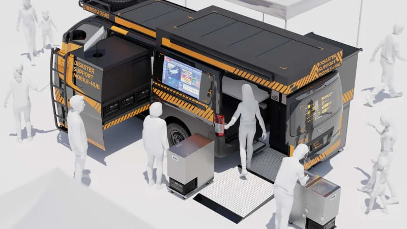 Leaving the pavement again, the Disaster Support Mobile-Hub started life as a Caravan, which is another minivan sold in global markets. Unlike the car-derived Serena, it’s closer to a commercial vehicle and marketed as a heavier-duty hauler. These sturdy bones made it perfect for its new role as a disaster support center. Nissan added a winch, beefy tires, a roof rack, and a cool sliding rear end before packing the interior with a long list of communications equipment. It then installed a Leaf-sourced battery pack on the roof to power the electronics.