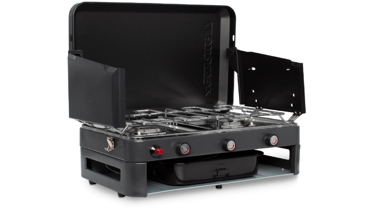 If you’re looking for something a little more beefy than the Eureka grill above, this Zempire camping stove could be just what you need. It uses propane rather than butane, has 2 stove-top burners that reach up to 10,000 BTUs of heat and a grill/toaster that reaches 3,500 BTUs. Both the burners and the grill can all be used simultaneously. Each burner has a push-button start and are independently adjustable. Like the Eureka, this also has a removable drip tray.