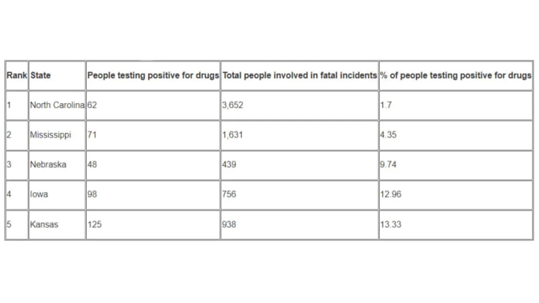 On the opposite side of the report, North Carolina, Mississippi and Nebraska were the three states with the lowest number of people involved in drug-related incidents. Respectively, the states registered 1.7%, 4.35%, and 9.74% of people involved in a fatal crash.