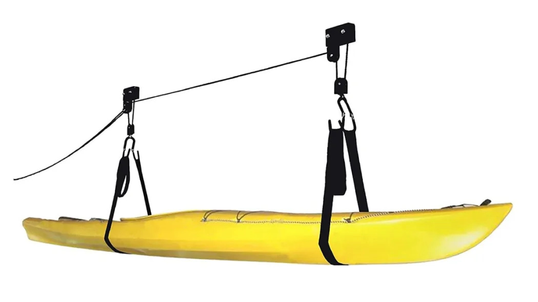 The RAD Sportz Kayak Hoist is a garage ceiling-mounted system that can store kayaks, canoes, bikes and other large items. The pulley system is used to raise and lower your gear and is compatible with ceilings up to 12 feet high. The pulley is built with aluminum and has rubber-coated hooks. The safe locking mechanism and automatic locking brake prevent your cargo from falling while suspended above.