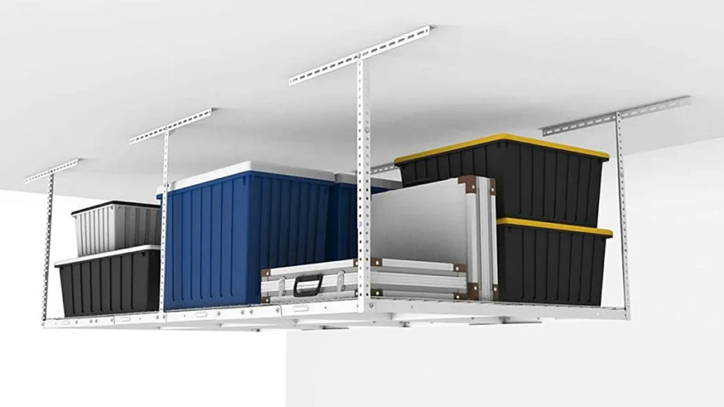 This Fleximounts Overhead Garage Storage Rack is a ceiling-mounted storage solution. The storage rack can drop down between 22” and 40”. The rack can support a maximum weight capacity of 600 pounds. It’s built with heavy-duty steel and high-quality screws This product comes with a lifetime warranty.