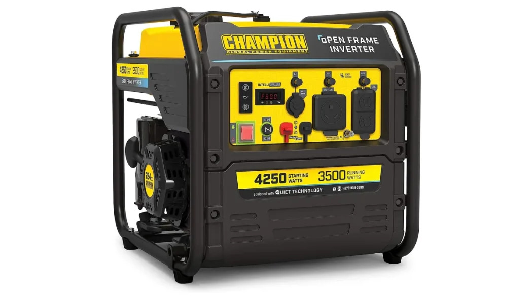 This Champion Power Equipment RV Ready Open Frame Inverter Generator is powered by a four-stroke gas engine and reaches a maximum output of 4,250 starting watts and 3,500 running watts. It has a 120v 30A RV outlet, two 120V 20A household outlets and two USB ports. Free lifetime technical support and a 3-year limited warranty is included with your purchase.