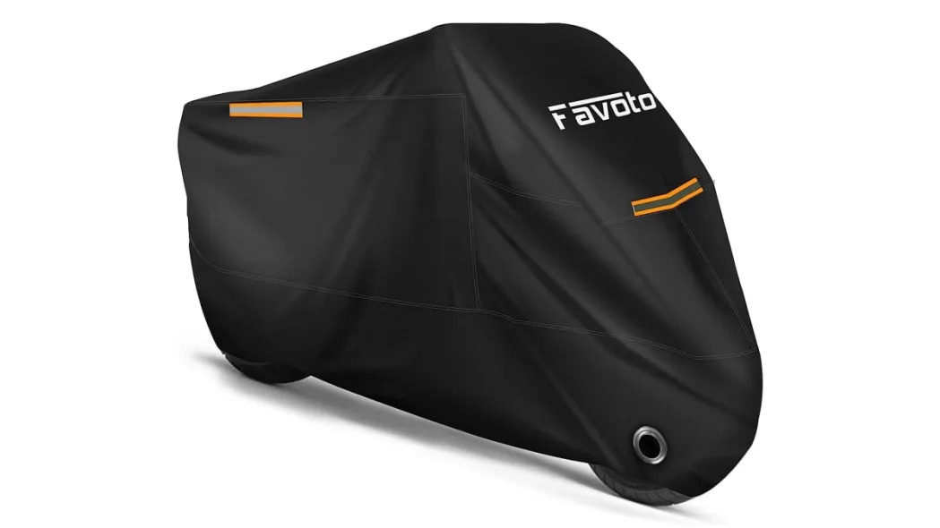 This Favoto Motorcycle Cover is made from polyester fabric and covers bikes up to 96.5” in length. It’s waterproof and has windproof buckles to keep it in place during inclement weather conditions. There are 3 reflective strips that make it easier to see at night. The anti-theft lock hole comes with a lock you can place to keep the cover secure from potential thieves.