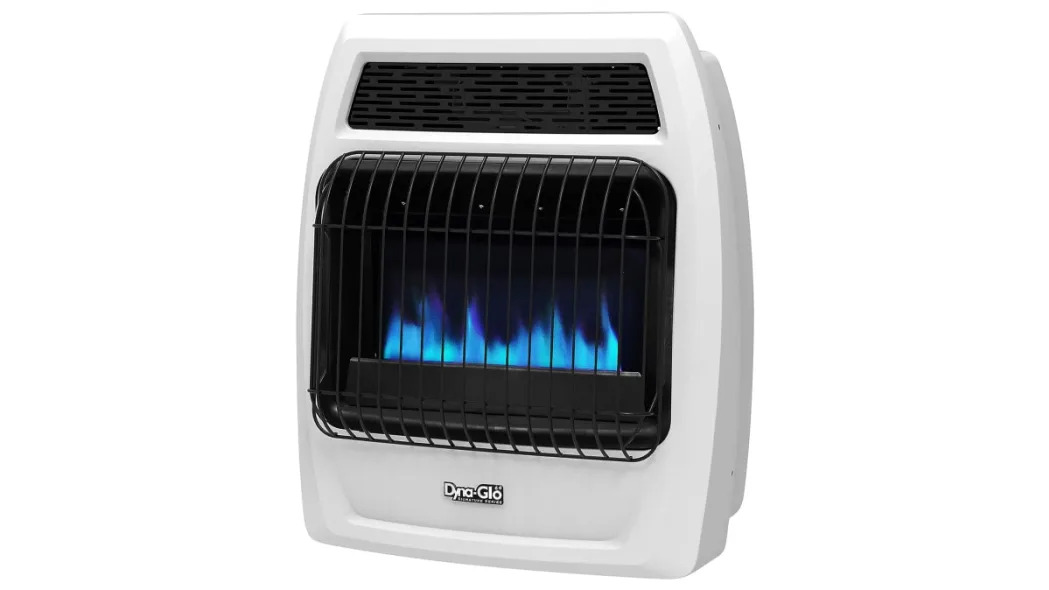 This Dyna-Glo Liquid Propane Blue Flame Thermostatic Vent Free Wall Heater has a BTU output of 20,000 and a heating coverage that reaches up to 700 Sq. ft. The blue flame technology uses convection to create heat to warm up the system. The blue flames are meant to resemble an actual fireplace
