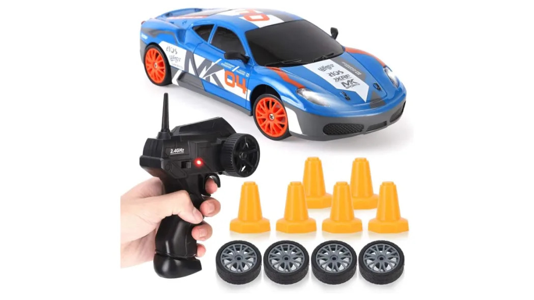 This BIFYTON Remote Control Car operates on a rechargeable 3.7 500mAH rechargeable battery and reaches a top speed of 8.7 mph. It has 360° drifting, four traffic cones and a set of standard tires with an extra set of drift tires.