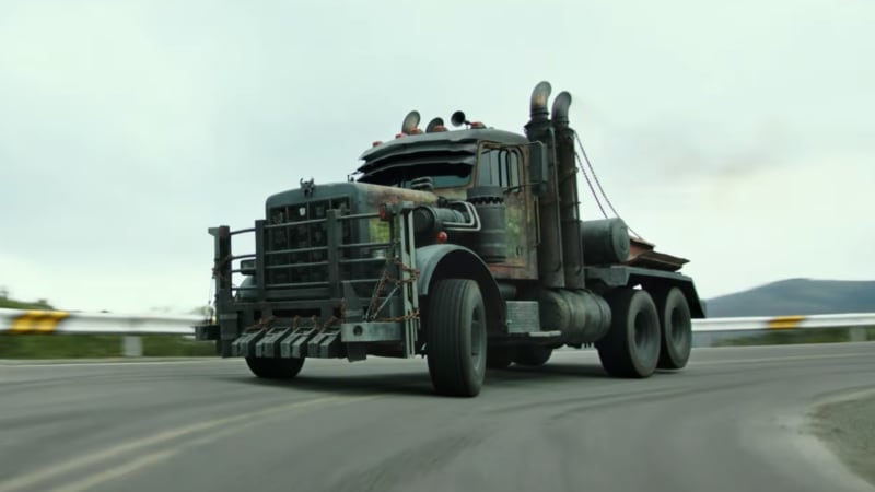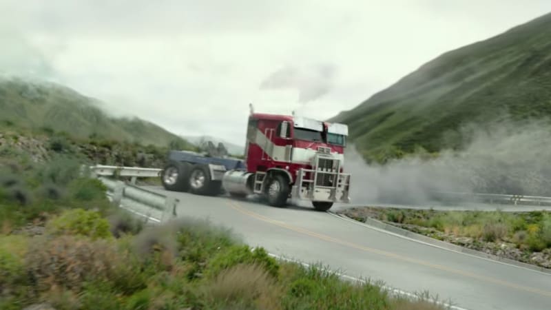 The trailer shows an orange GMC wrecker doing its road warrior fight with Wheeljack and Arcee on a mountain pass. It uses its tow hooks to latch onto Nightbird, who then swings the heavy-duty truck 180 degrees while maintaining the same speed with the Skyline driving forward and the GMC in reverse. It’s a trick that would be impossible for Earth vehicles, but presumably Transformers have different transmission gearing than our primitive human-engineered cars. That probably also explains why the blower launches rockets instead of taking in air.