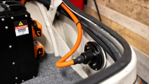 Power for the motor comes from six liquid-cooled Tesla 18650 batteries wired in series. It has a total pack voltage of 144 volts and a 32-kWh capacity. Power flows from the batteries through a sealed HV junction box. Martin noted that the box contains all of the switches, fuses and service disconnects to keep everything safe. He also installed a battery management system that monitors voltage, temperatures, amperage and the state of charge. If the system detects an issue, it will shut down the vehicle to prevent damage.
