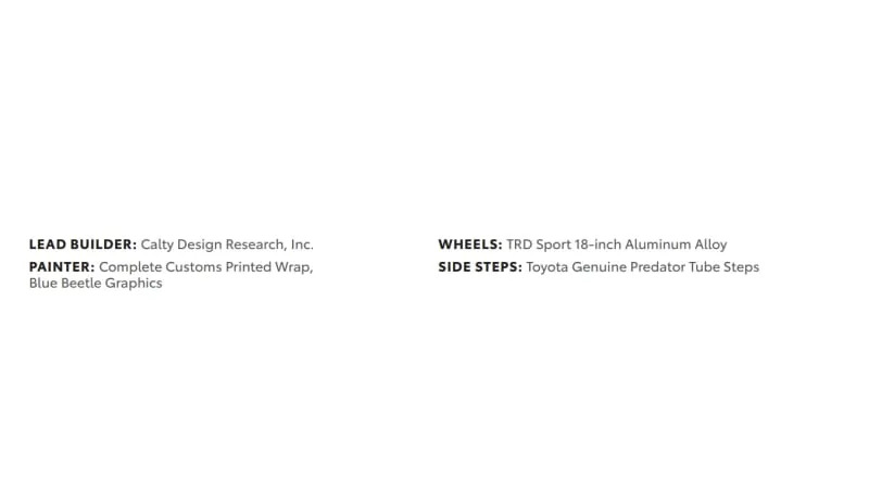 Toyota’s builds will sit alongside a collection of its current production models at the Las Vegas Convention Center Central Hall, Booth No. 22200, from Oct. 31 through Nov. 3.