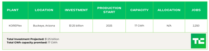Battery cell and module developer Kore Power announced in March that it had received approval to build a battery manufacturing factory in Buckeye, Arizona. Kore Power will produce batteries for energy storage systems and e-mobility products, including cars, trucks, buses, boats and trains. The company told TechCrunch it intends to support OEMs by manufacturing 30D-compliant batteries, so Kore is working closely with domestic partners to line up critical materials suppliers onshore.
