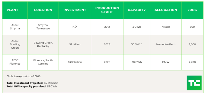 AESC (formerly Envision AESC) is a Japanese battery technology company that has promised to build  three U.S. facilities before the end of the decade. The company’s Tennessee plant has been in operation for some time. AESC broke ground at its Kentucky and South Carolina plants in August 2022 and June 2023, respectively. In March this year, AESC said it would expand its South Carolina operations, bringing total investment in the project up to $3.12 billion.