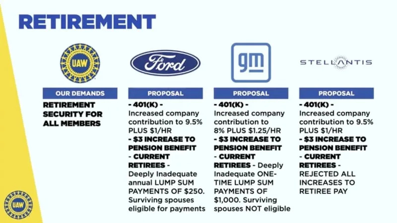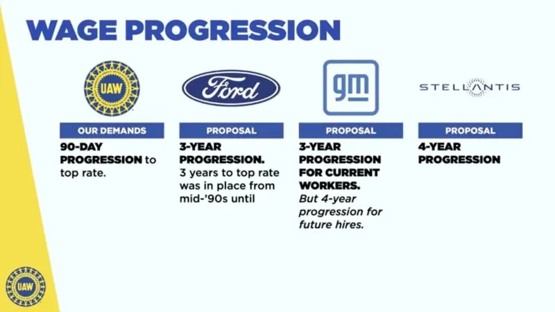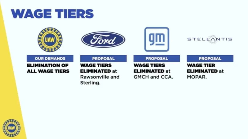 The union, waging its first simultaneous strikes against the Detroit Three automakers, opened bargaining with a demand for a 40% wage hike. The demand included a 20% immediate increase, elimination of different pay scales among UAW workers and restoration of defined benefit pension plans. The union also demand that battery plant workers be covered under union agreements.