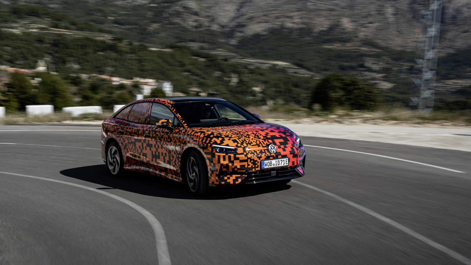 My time behind the wheel of the ID.7 was spent in a pre-production, fully-camouflaged prototype on the squiggly roads that run through the mountains north of Alicante, Spain. It takes a couple of turns to realize that this big sedan doesn’t drive like a rear-wheel-drive car. This is partially due to the heavy battery pack mounted under the cabin, where it lowers the center of gravity and places it in the middle of the car. The result is handling that’s more balanced and less playful than you’d expect from a rear-driven, rear-engined sedan. It’s quiet and comfortable above all, and Volkswagen fitted a five-link rear axle that helps deliver the kind of smooth, predictable ride you want on a long drive.