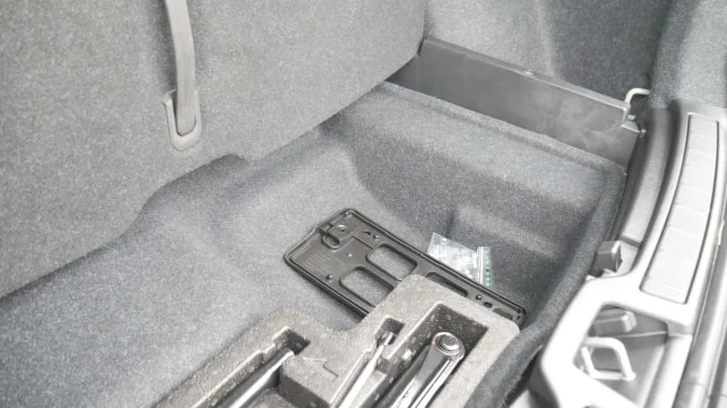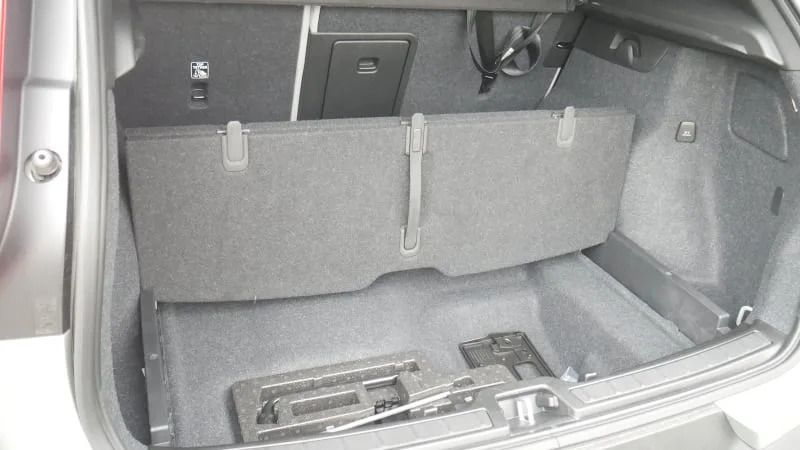 This is the underfloor area, which is where the XC40 Recharge diverges from the gas-only XC40. I don’t know what it looks like under there, but Volvo’s uniquely extensive specs would indicate there’s more space available should you get the tire repair kit (2.7 cubic-feet versus the Recharge’s 2.4 cubic-feet you see here). If you get the spare tire, you have less space at 1.7 cubic-feet. You also have a spare tire.