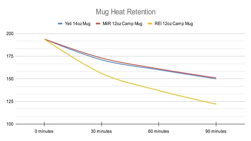 After an hour, the temps for each were Yeti 160, MiiR 161 and REI 137, and after 90 minutes the temperature for each was Yeti 150, MiiR 151 and REI 122. All of that said, I generally don’t wait 90 minutes to drink my cup of coffee. In fact, I am usually on cup number three by then.