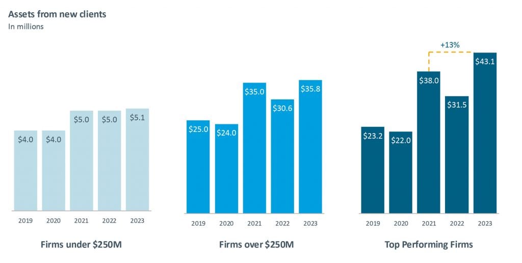 The top performers gained 2.4 times more new-client assets than all other firms in 2023. Top-performing firms gained $43.1 million in assets from new clients in 2023, compared with $17.9 million for all other firms.