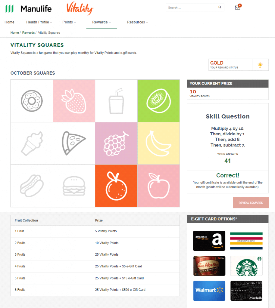 An embedded fun game Vitality Squares™ allows you to play monthly for Vitality Points and e-gift cards.