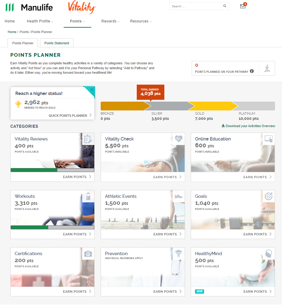 For example, members of the Manulife Vitality Plus program are able to collect a certain number of points for various activities, qualifying them for bronze, silver, gold or platinum status. Here are savings associated with each level: