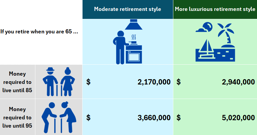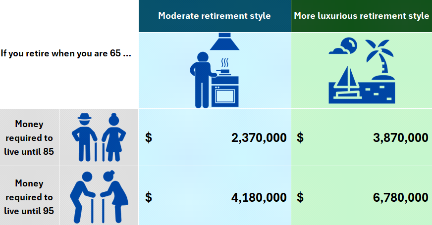 Your estimated retirement budget could be between $2.4M and $3.1M for moderate and luxurious retirement styles respectively when you plan until the age of 85 and between $4.1M and $5.5M for moderate and luxurious retirement styles respectively if you live to the age of 95.