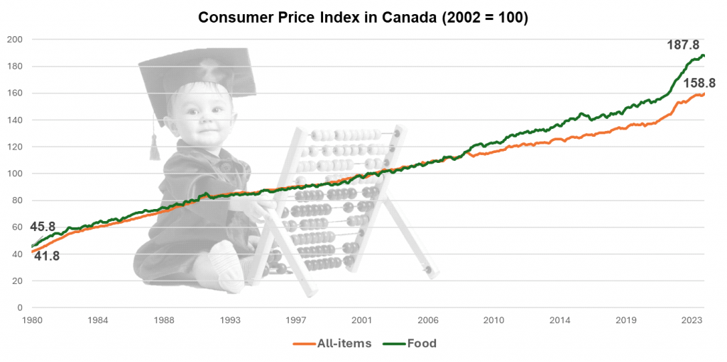 If we look at real estate prices, this development becomes even more drastic, especially in cities like Toronto and Vancouver. For example, in 1980 the average price of a Toronto property was $75,694. In 1990 – $255,000, in 2000 – $243,255. In 2010 it was $431,262 and in 2020 it was $939,636. In 2023 costs soared further to $1,126,591.