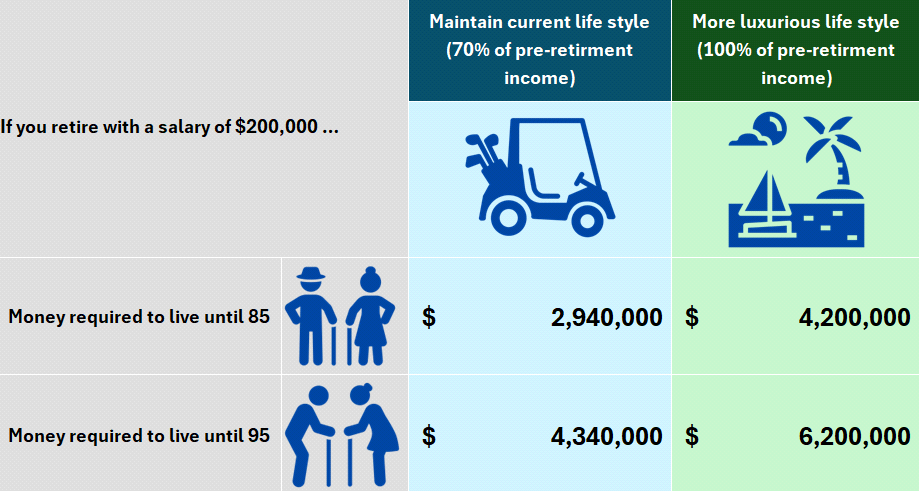 To retire at 65 on a salary of $200,000, aim for around $2.9M for age 85 and $4.2M for age 95. If you need your full pre-retirement income you need approximately $4.3M if you plan to live until the age of 85 and $6.2M if you plan to live until the age of 95.