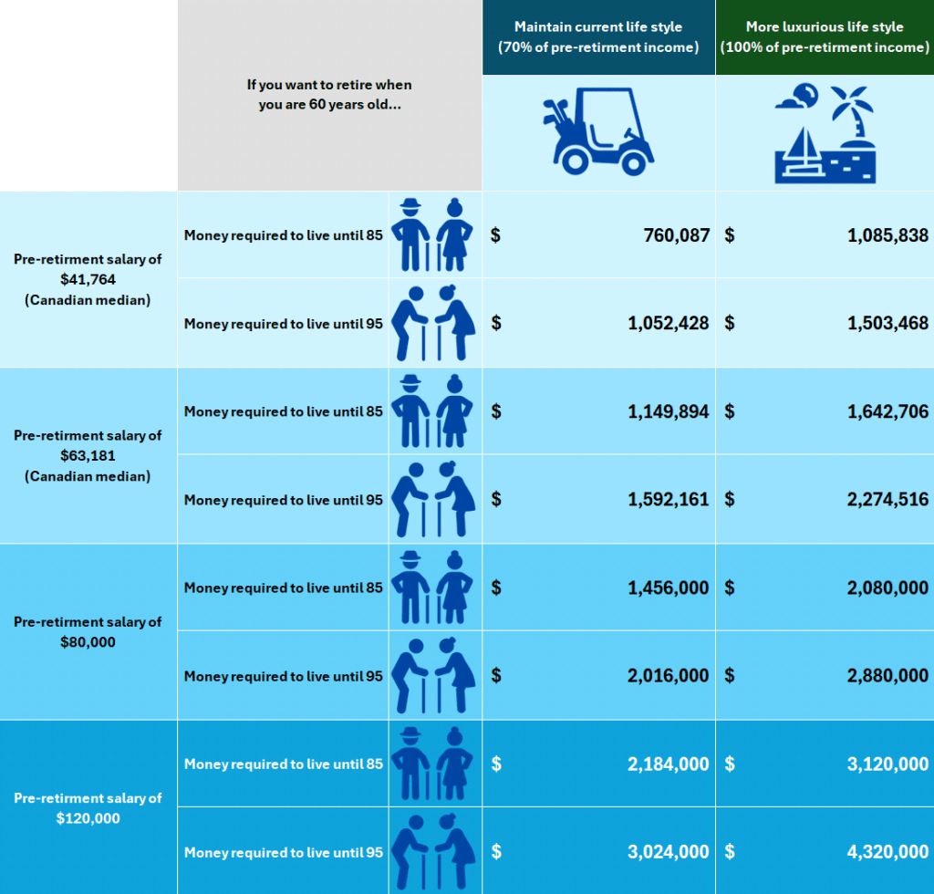 To retire at the age of 55 while having a salary just shy of $42,000 (again considering the Canadian median income of $41,763), you would need approximately $0.9M to comfortably reach the age of 85 and $1.3M to reach 95. However, to retire on full pre-retirement income, you need approximately $1.2M to reach 85 and $1.7M to reach 95. Note that if your pre-retirement income is higher, you should plan for higher retirement funds, according to the table below.