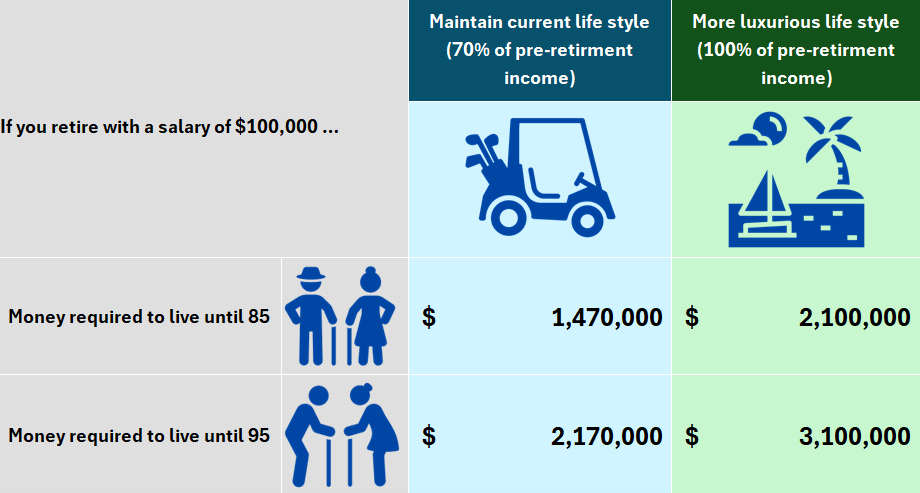 Let’s look at a simplified approach considering maintaining your current lifestyle. Here, you need to plan for 70% of your pre-retirement salary for each year of your life. Should you spend your retirement living in luxury, plan for your full pre-retirement income for each year of your life in retirement.