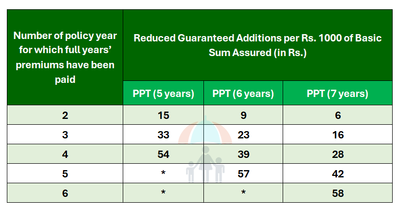 For the reduced paid-up policy, guaranteed addition will accrue with the reduced rate as given below.