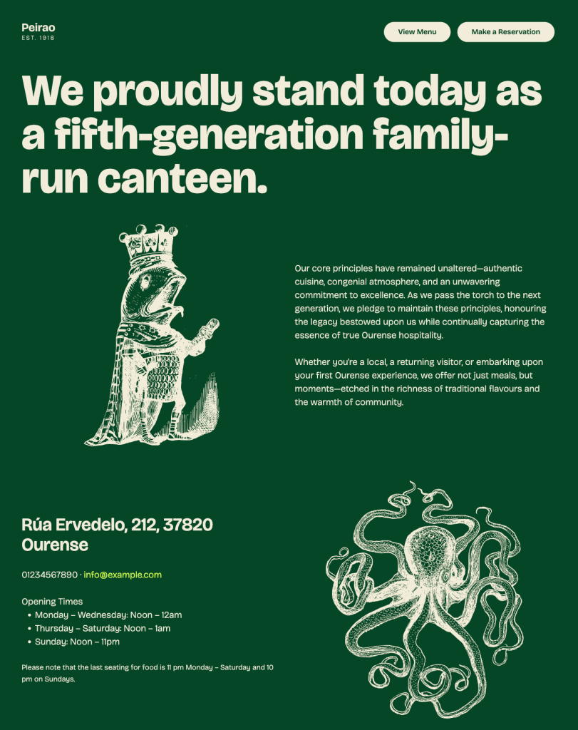 Peirao is a theme inspired by the pervasive use of deep green paint on restaurant doors in Galicia, Spain. It’s the perfect look for a restaurant whose authenticity and history are their brand.