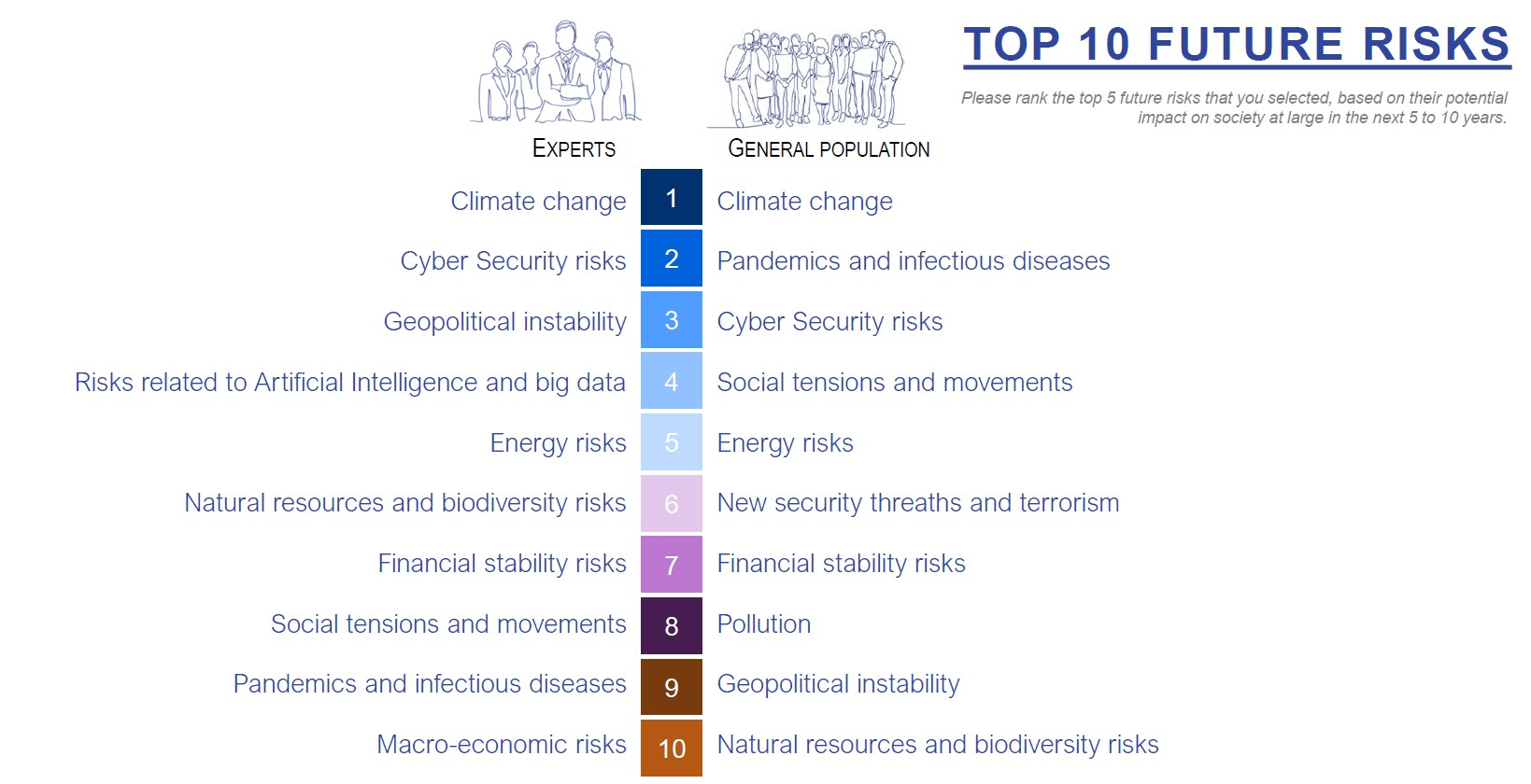 Meanwhile, on the general population side, pandemics are still feared as they ranked second in the top future risks report. Cybersecurity placed third for the general populace, while social tensions and energy risks rounded out the top five. Risks related to artificial intelligence and big data failed to crack the top 10 for the general population as it got beat by natural resources and biodiversity risks.