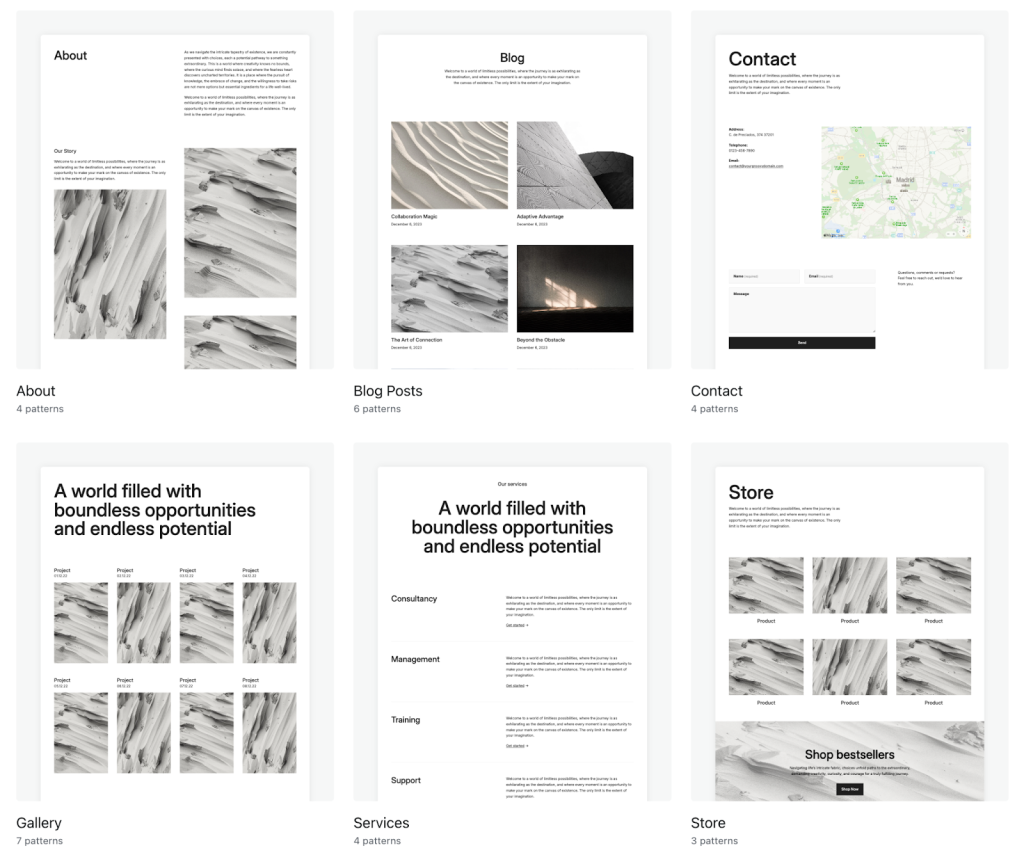 Sometimes you just need the components of a post, page, or template: a header, a “Subscribe” box, a store module, etc. Other times, you want to be able to copy and paste an entire page into existence. Scroll down past the categories and you’ll find our full-page patterns for whole pages: About, Blog, Contact, Store, and more.