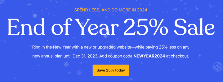 With just one week left in 2023, time’s running out to lock in a 25% savings on making those New Year’s resolutions happen for your site in 2024. If you saw our last announcement, you’ll know that we’re offering 25% off all annual paid plans until the end of year. So now’s the time—as soon as the clock strikes midnight on January 1st, this deal will be as done as 2023.