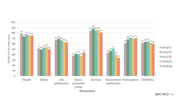 The GCRO constructs a multidimensional index of wellbeing that combines 33 variables into one measure, known as the Quality of Life Index, from survey data that has been collected every two to three years since 2009.