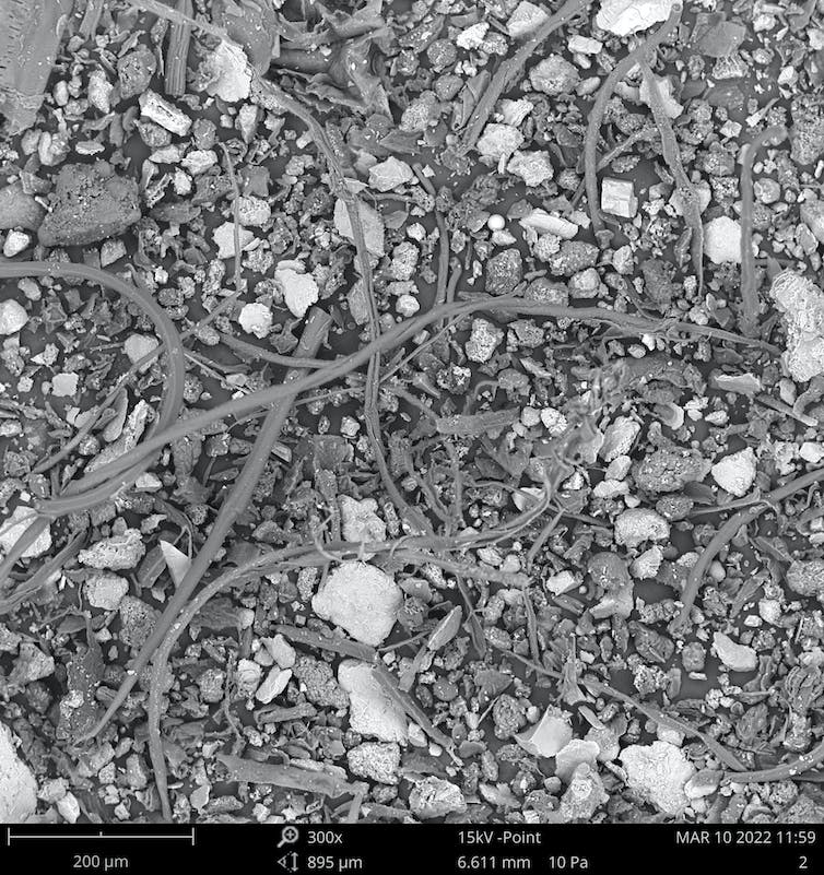 High-magnification images of house dust showed mineral particles that have been blown in or tracked in on shoes. The rest of the dust was elongated fibres and hair from indoor sources.